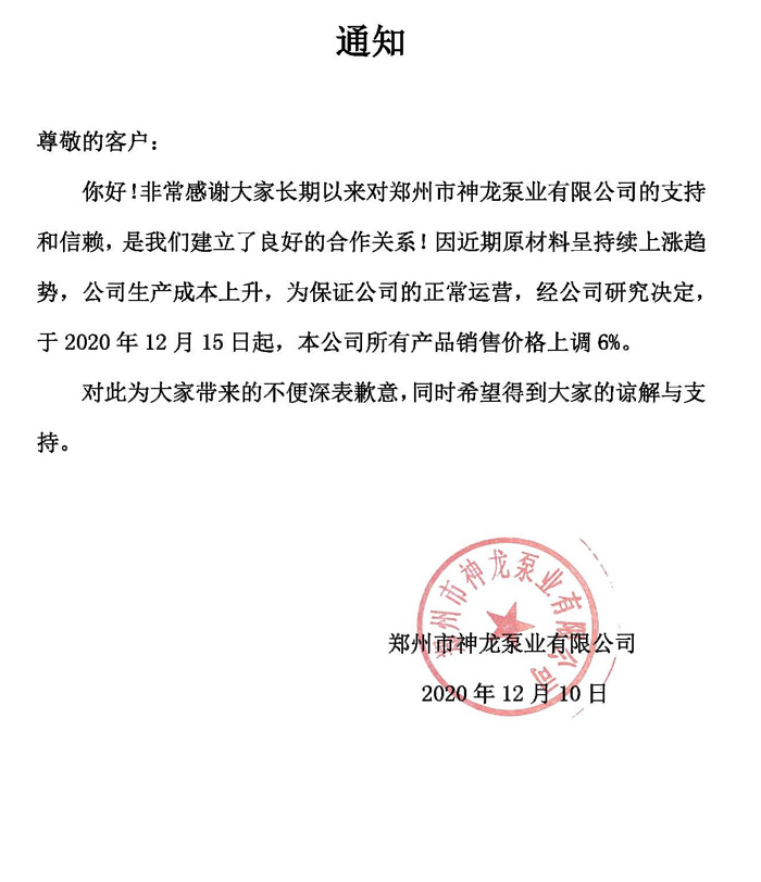 本公司所有產(chǎn)品于2020年12月15日起銷售價格上調(diào)6%